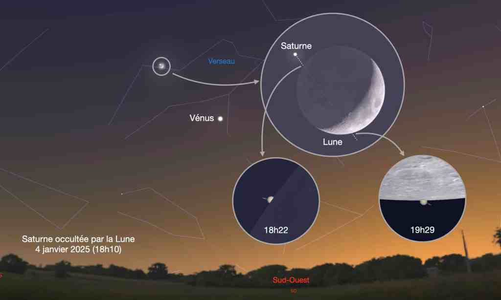 Ce samedi 4 janvier, peu après le coucher du Soleil, un joli ballet s’offre à nos yeux : la brillante Vénus se trouve à proximité du croissant de Lune, tandis qu’une « étoile » un peu plus discrète — en réalité la planète Saturne — se glisse doucement derrière le limbe lunaire.