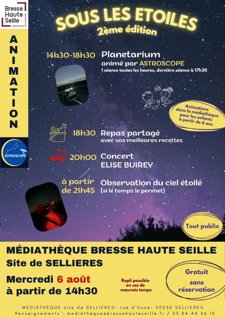 Rendez-vous le 6 août prochain à la médiathèque de Sellières pour faire le plein d’astronomie !